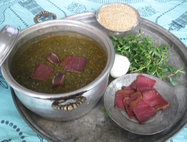 Bat: Mercimek bir tencerede haşlanır ve soğuması için bekletilir. Düğüm sıcak su ile ıslatılır. Daha sonra mercimek ve düğü, salça ve suyla karıştırılır. Bu karışım çorba kıvamındadır. Bir tarafta domatesler küçük küçük doğranır, diğer yandan cevizler bir havanda dövülür, soğan, maydanoz, dere otu, reyhan ince ince kıyılır. Tüm malzemeler salça ile karıştırılır. Son olarak tuz ve biber eklenir. Bağ yaprağı ve köy ekmeğiyle servis yapılır.