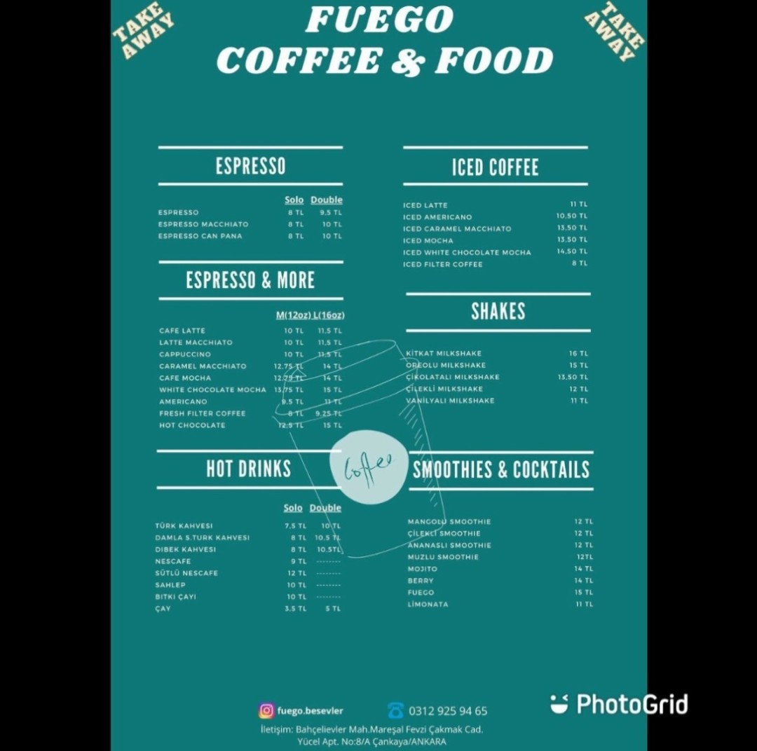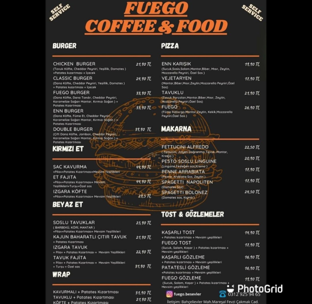Çay ve Kahve Et Izgara Kahve Makarna Meyve Suyu Pizza Salata Tatlı
